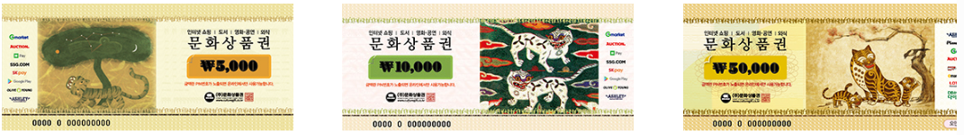 (주)문화상품권의 지류 문화상품권은 아래와 같이 호랑이 그림이 그려져있는 문화상품권입니다. 온/오프라인에서 사용할 수 있으며 구체적인 사용처는 공식홈페이지(클릭)을 참조하세요